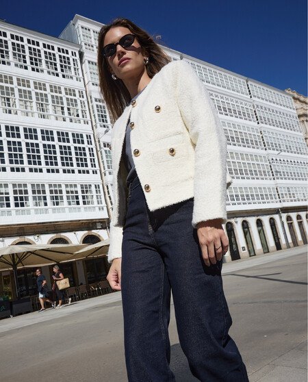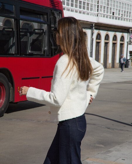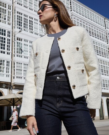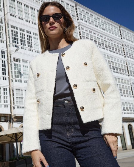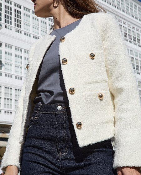 Chaqueta tweed recta con cuello redondo y manga larga. Cuatro bolsillos de solapa en la parte delantera. Cierre delantero con botones.