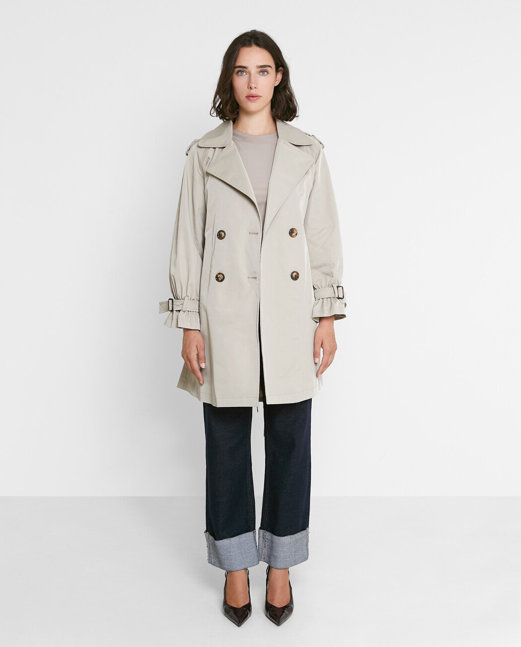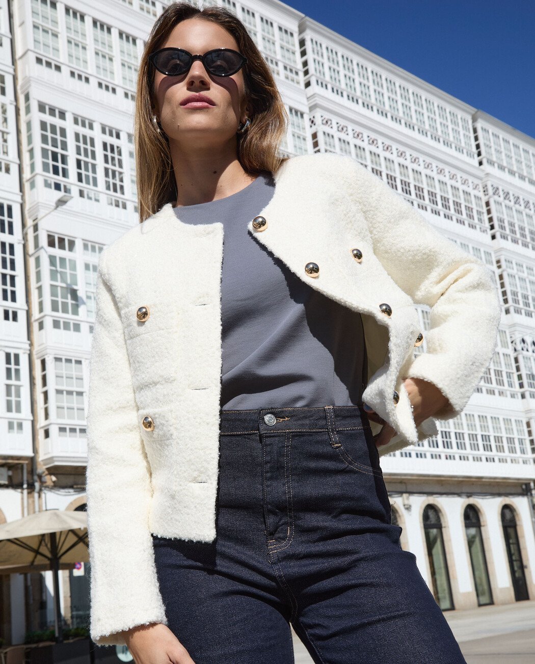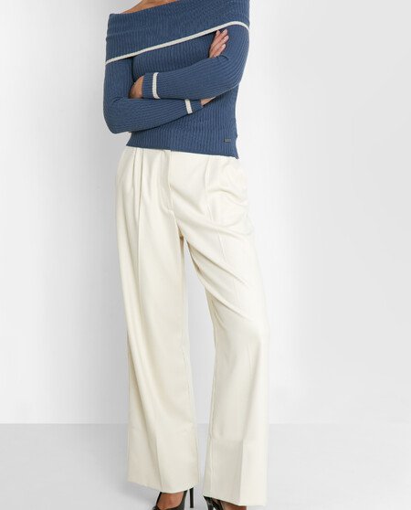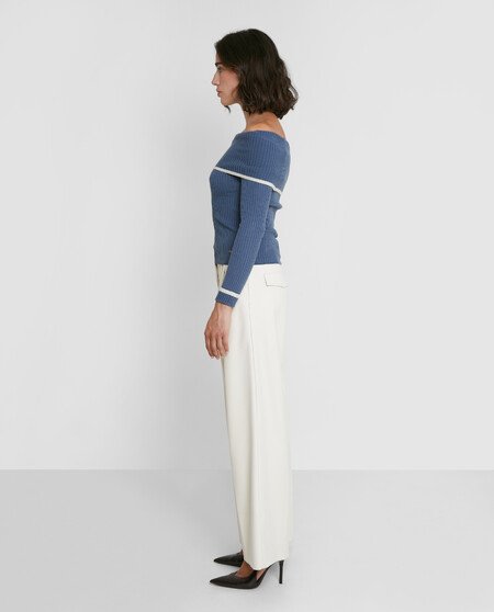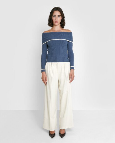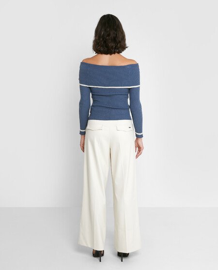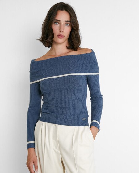 Jersey manga larga. Escote vuelto. Hombros descubiertos.